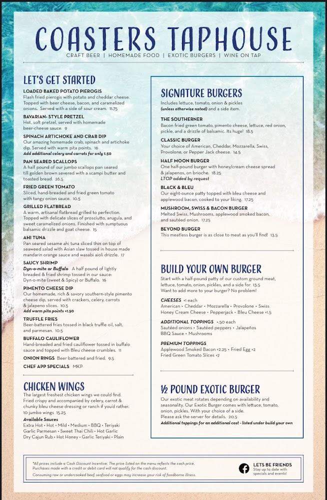 Welcome to Coasters Taphouse, Cocoa Beach's cherished gastropub where culinary excellence meets the breezy charm of the coast. Nestled conveniently off N Atlantic Ave, our inviting restaurant boasts a vibrant atmosphere perfect for breakfast, lunch, or dinner. Indulge in a diverse menu featuring local specialties, paired with an impressive selection of cocktails, beers, and wines. With amenities like delivery and takeout, along with wheelchair accessibility, everyone can enjoy our speedy service and memorable dining experience. Raise a glass and savor the good life at Coasters Taphouse, where amazing food and fun come together!